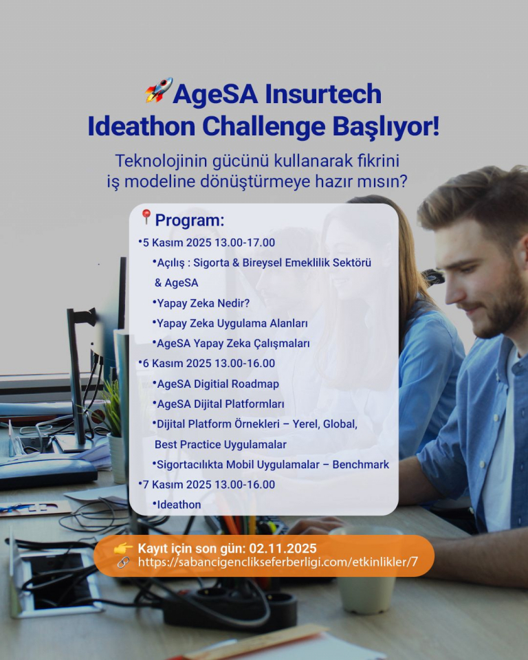 Teknolojinin gücünü kullanarak fikrini iş modeline dönüştürmeye hazır mısın? 5-7 Kasım tarihlerinde gerçekleştirilecek olan "AgeSA Insurtech Ideathon Challenge" etkinliğine başvurmak isteyen öğrenciler aşağıda verilen linkten başvurularını gerçekleştirebilir. Son başvuru tarihi 2 Kasım.